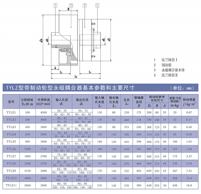 ■TYLZ型永磁耦合聯(lián)軸(保護)器為帶制動(dòng)輪型,也可分為單法蘭軸套與雙法蘭軸套兩種聯(lián)接方式;