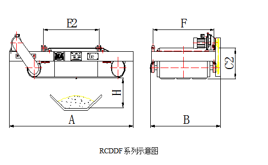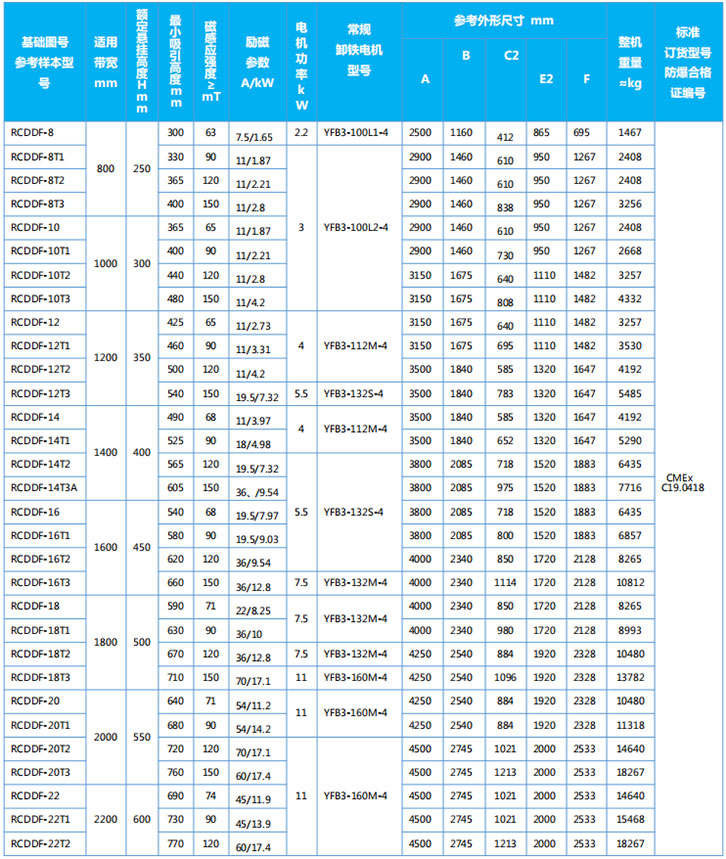 四、RCDDF系列粉塵防爆型帶式電磁除鐵器主要技術參數、外形尺寸