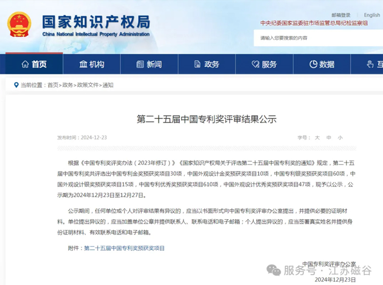 正值2025年元旦佳節(jié),江蘇磁谷迎來了一個振奮人心的消息:公司自主研發(fā)的《繞組式無刷耦合傳動裝置》發(fā)明專利榮獲中國專利獎優(yōu)秀獎。這一殊榮不僅為公司的科技創(chuàng)新征程增添了輝煌篇章,更為新年的啟航注入了澎湃動力與無限可能。 中國專利獎,由國家知識產(chǎn)權(quán)局攜手世界知識產(chǎn)權(quán)組織共同設立,乃我國專利領(lǐng)域的至高榮譽,其評選標準嚴苛,強調(diào)知識產(chǎn)權(quán)的創(chuàng)造、保護與應用,對激發(fā)技術(shù)創(chuàng)新、驅(qū)動經(jīng)濟高質(zhì)量發(fā)展具有深遠影響。
